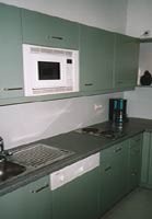 L-Form mit eingebauter Mikrowelle, Kühlschrank und Spühlmaschine.